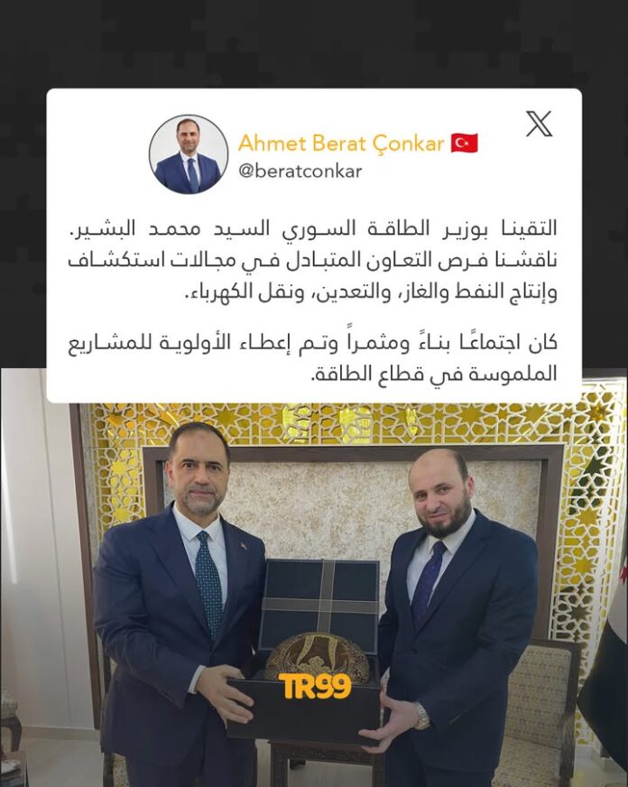 🔸نائب وزير الطاقة والموارد الطبيعية التركي أحمد تشونكار يعلن عن مباحثات تركية–سورية لتعزيز الشراكة في النفط والغاز والكهرباء.