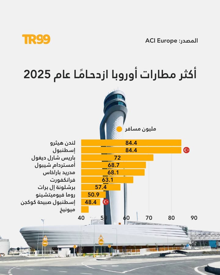 📌 حافظ مطار لندن هيثرو على لقبه كأكثر مطارات أوروبا ازدحامًا، حيث بلغ عدد مسافريه 84.48 مليون مسافر خلال العام. في المقابل، حلّ مطار إسطنبول (IGA) في المركز الثاني، مسجلاً 84.44 مليون مسافر، بفارق 40 ألف مسافر فقط.