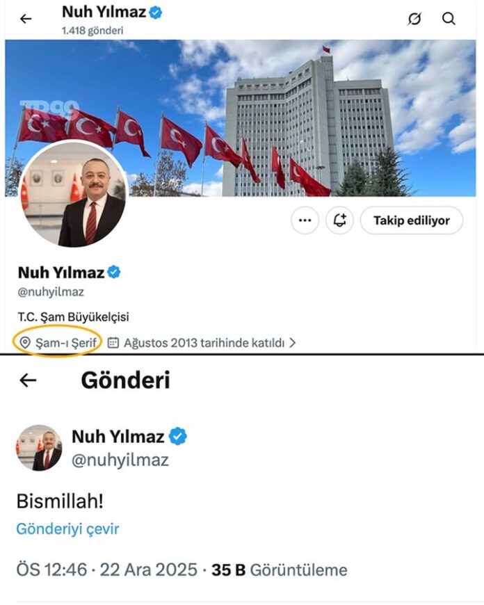 📌 كما غيّر يلماز توصيفه على حسابه الشخصي في “إكس” من “نائب وزير الخارجية التركي” إلى “سفير الجمهورية التركية في دمشق”.