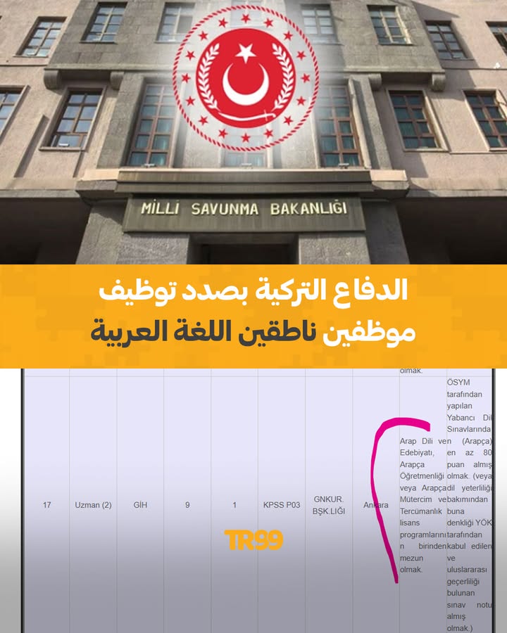 📌أعلنت وزارة الدفاع التركية عن فتح باب التوظيف لموظفين يجيدون اللغة العربية للعمل في العاصمة أنقرة ضمن فئة وظائف حكومية.