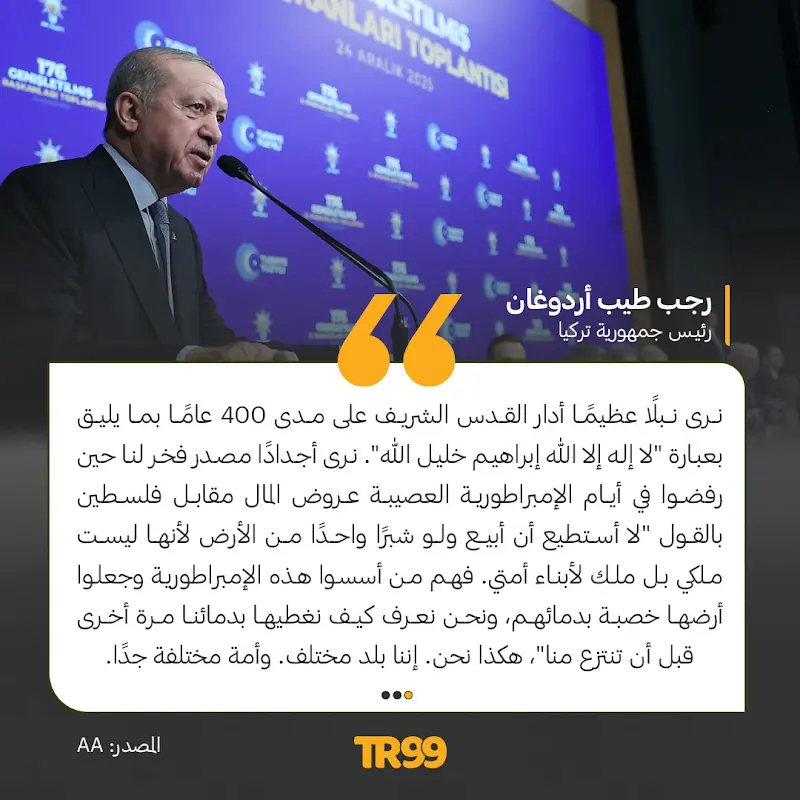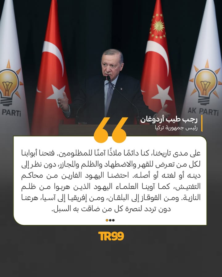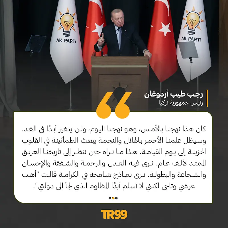 🗣️مستشهدًا بالماضي.. الرئيس أردوغان يؤكد على موقف تركيا غير القابل للمساومة أو التنازل من قضايا مثل فلسـ.طين، في كلمة بفعالية لحزبه العدالة والتنمية بأنقرة.