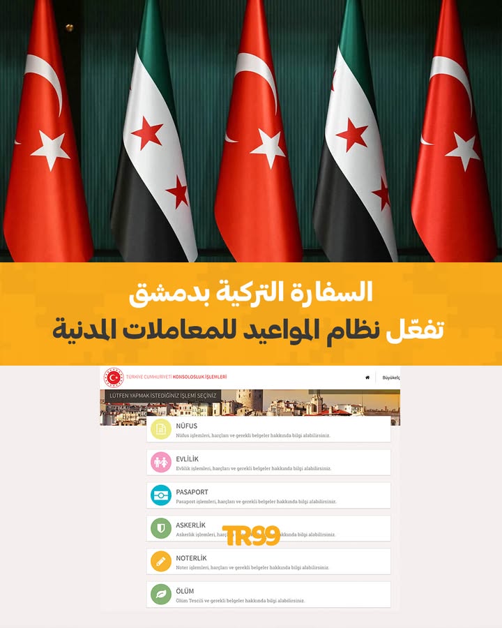 📌فعّلت السفارة التركية في دمشق نظام حجز المواعيد المسبقة لإجراء المعاملات المدنية داخل السفارة، في خطوة تهدف إلى تنظيم سير المعاملات وتسهيل حصول المراجعين على الخدمات القنصلية.