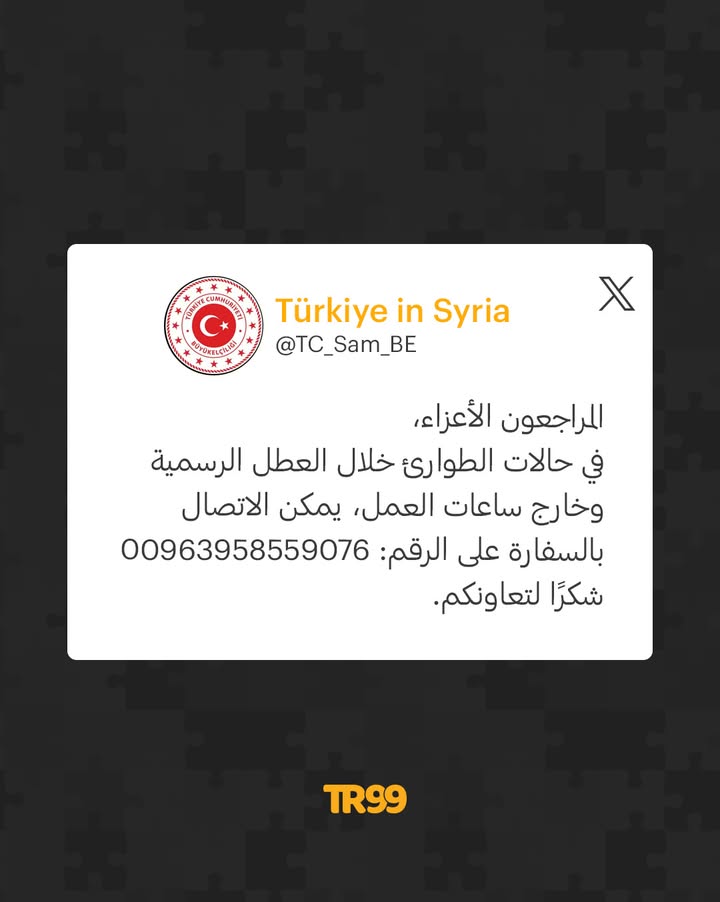 🔸السفارة التركية في دمشق تنشر رقم تواصل من أجل الحالات الطارئة.