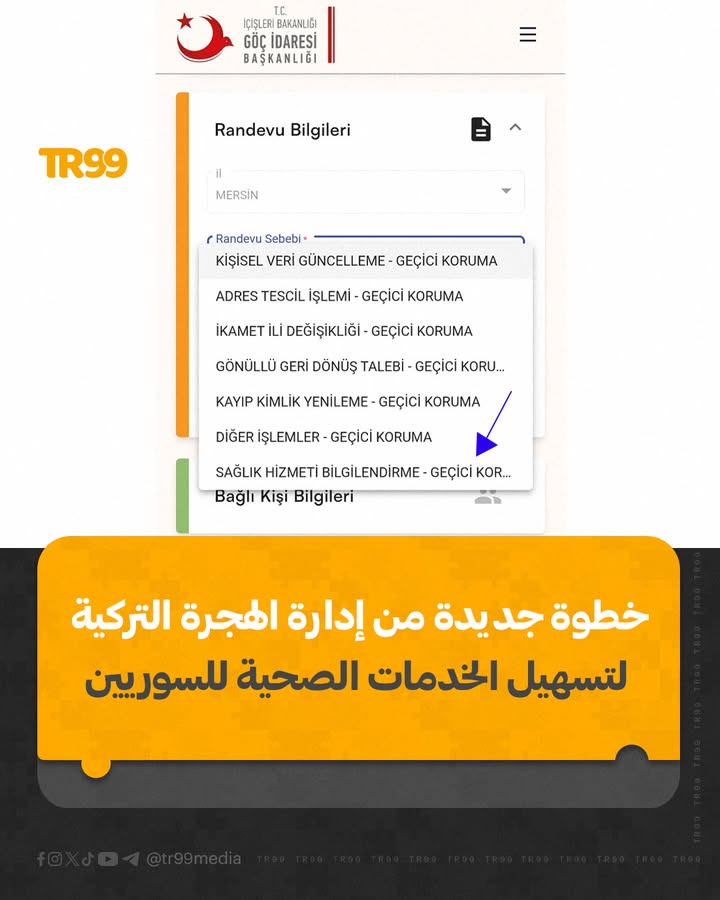 📌أدرجت إدارة الهجرة في تركيا خيارًا جديدًا ضمن نظام حجز المواعيد، يهدف إلى تقديم تسهيلات للأجانب، وخاصة السوريين الخاضعين للحماية المؤقتة، ممن يعانون من أمراض مزمنة أو يملكون تقارير طبية، إضافة إلى غير القادرين على تحمّل تكاليف العلاج والمشافي.