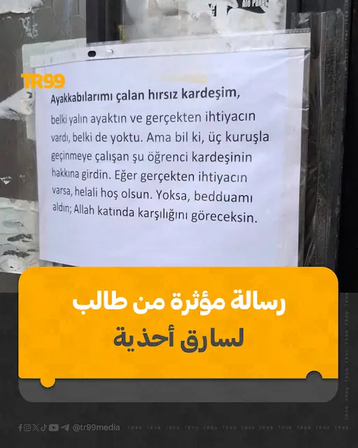 🔸 سرعان ما حظي حادث صغير ولكنه مؤثر في كوتاهيا باهتمام واسع النطاق على مواقع التواصل الاجتماعي. فبدلاً من الغضب أو الاتهامات، ردّ طالب جامعي سُرقت أحذيته برسالة هادئة وواعية علّقها على بابه.