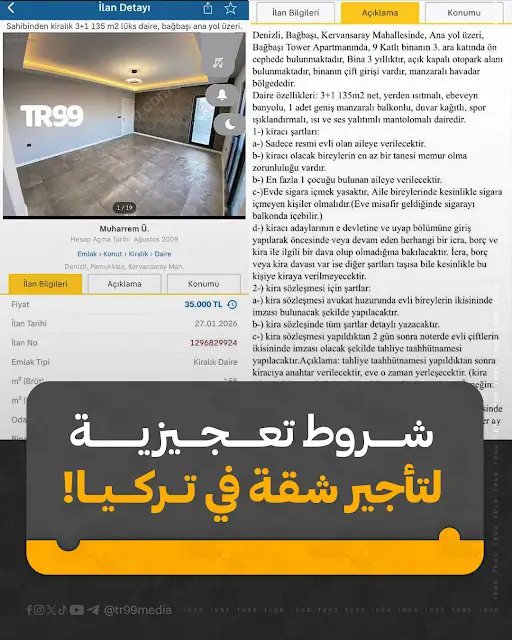 🔸 تداول مستخدمو وسائل التواصل الاجتماعي في تركيا إعلانًا نشره مالك شقة في ولاية دينزلي على موقع “صاهيبندان” تضمن قائمة شروط مبالغ فيها.