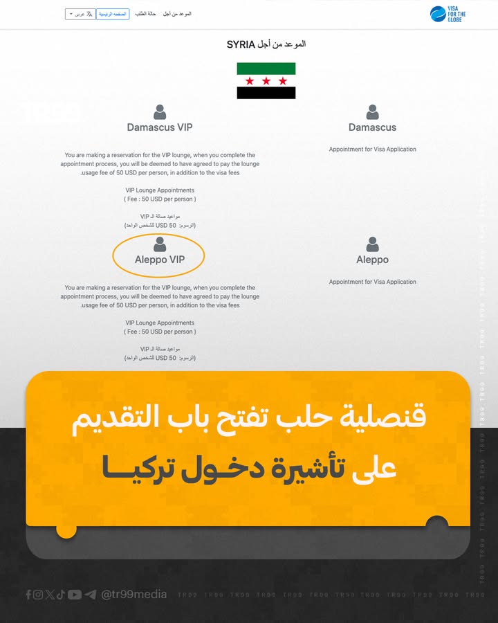📌فتحت شركة “Visa For The Globe” الوسيطة للتقديم على طلبات الحصول على تأشيرة الدخول إلى تركيا، خيار القنصلية التركية في حلب للحصول على التأشيرة على موقعها الالكتروني.