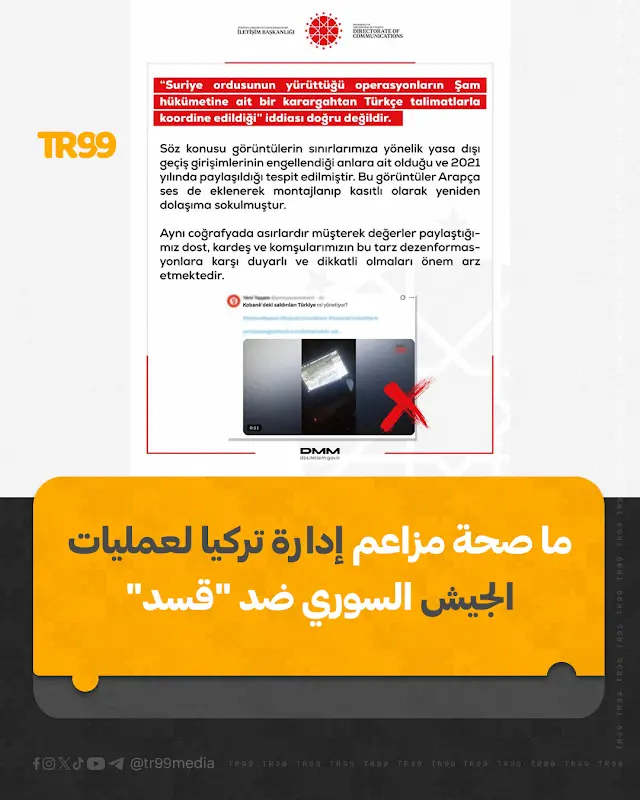 🔸 نفى مركز مكافحة التضليل التابع للرئاسة التركية صحة الادعاءات المتداولة على وسائل التواصل الاجتماعي بأن هناك “اندلاع حرب”...