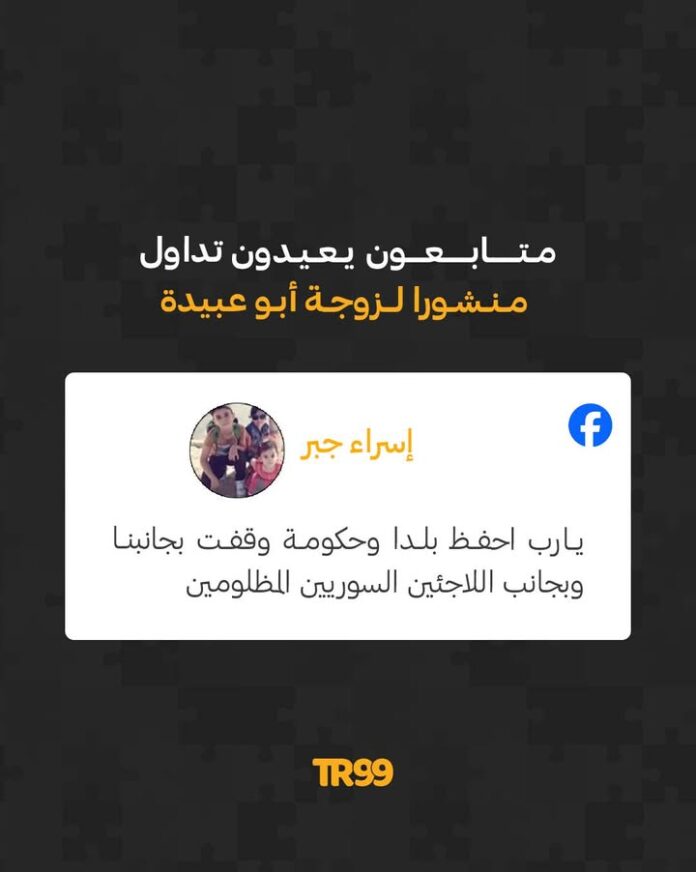 🔸 وسائل إعلام ومتابعون يعيدون تداول منشورًا للسيدة “إسراء جبر” زوجة المتحدث الشـ.ـهـ،ـيـ.ـد في كـ.ـتـ،ـائـ.ـب القـ.ـسـ،ـام أبـ.ـو عـ.ـبـيـ،ـدة (حـ.ـذيـ.ـفة الكـ.ـحلـ.ـوت) خلال محاولة الانقلاب الفاشل في تركيا في 15 يوليو/تموز 2016.