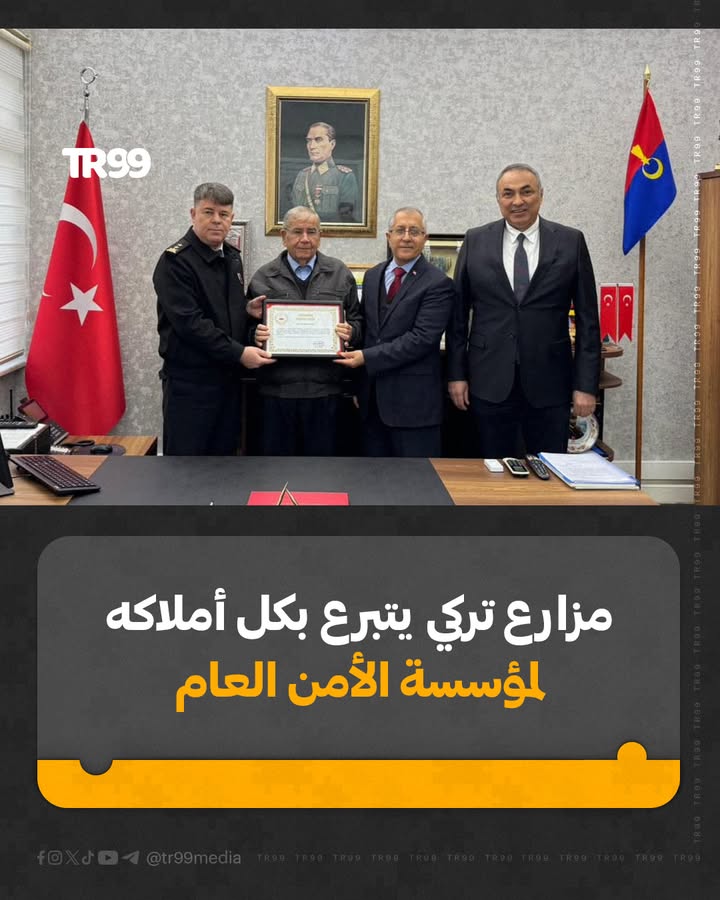🔸 تبرع عبد الله كابتان (78 عامًا)، وهو مزارع في منطقة إينيغول بولاية بورصة التركية بجميع أصوله وممتلكاته إلى مؤسسة الأمن العام التابعة لقوات الدرك (JAV) لاستخدامها بعد وفاته.