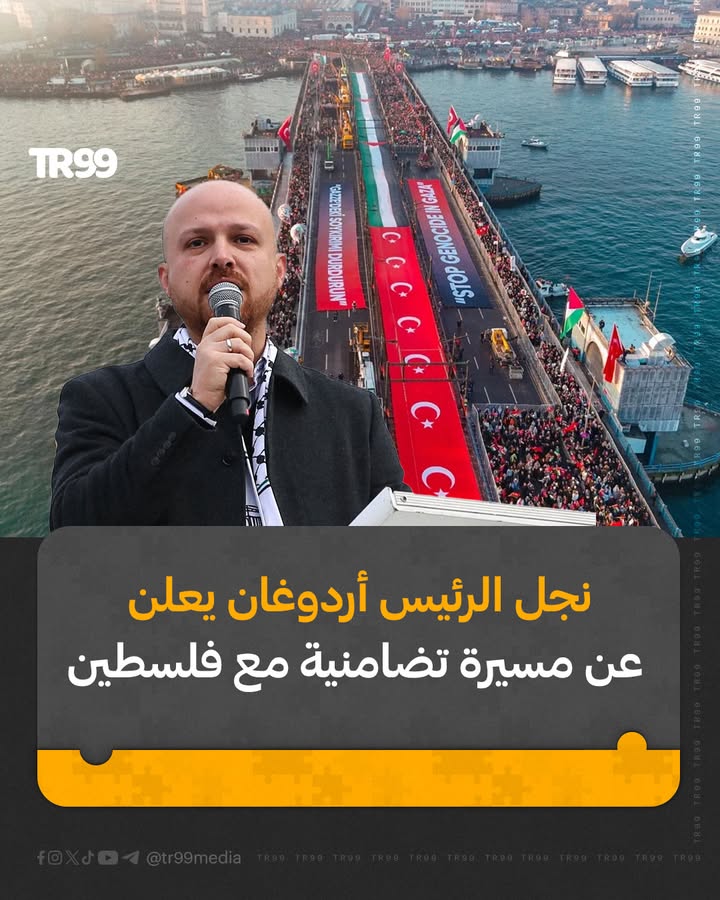 🔸 رئيس مجلس أمناء وقف نشر العلم “بلال أردوغان” يعلن عن مسيرة تضامنية مع فلسطين على جسر غالاطة وسط إسطنبول صباح اليوم الأول من عام 2026، وذلك للعام الثاني على التوالي.